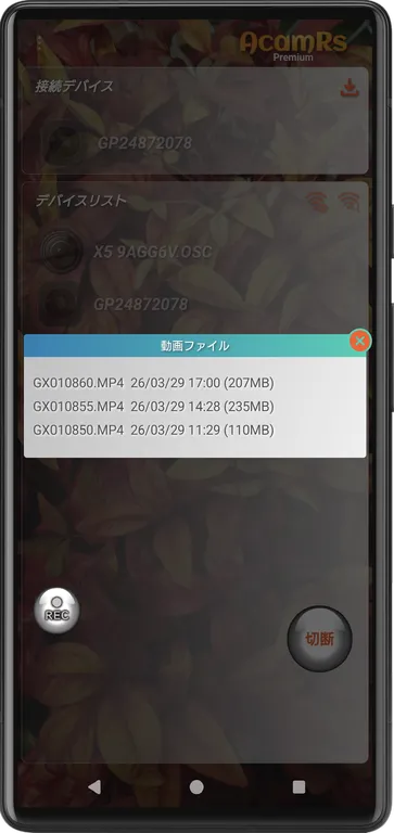 デバイス(アクションカメラ)の選択、接続と切断する画面です。