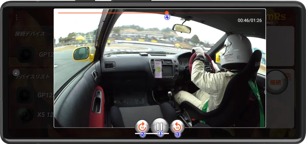 別のアプリを使用しながらフローティングボタンでの操作や、モータスポーツでクルマの動き出しや計測ラインの通過で録画などアクションカメラの操作をサポートします。