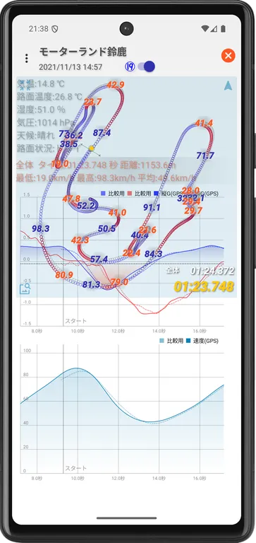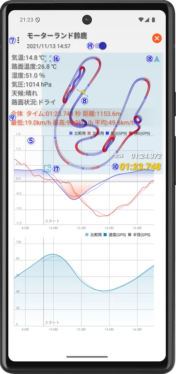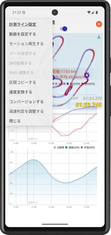 計測ラインを自由に設定、区間タイムの確認や走行データの比較表示など走行データを分析できます。