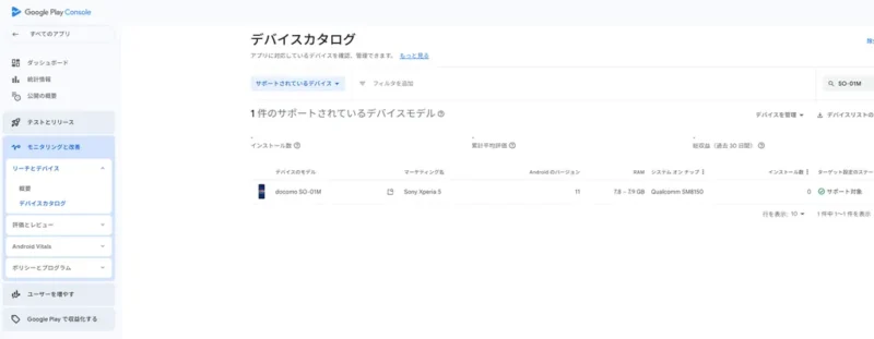 モニタリングと改善にあるデバイスカタログでアプリに対応しているデバイスを確認できます。