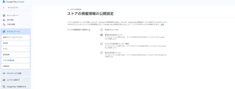 Google Playコンソールのストアの掲載情報の公開設定を「基本的な完全性チェック」に設定します。