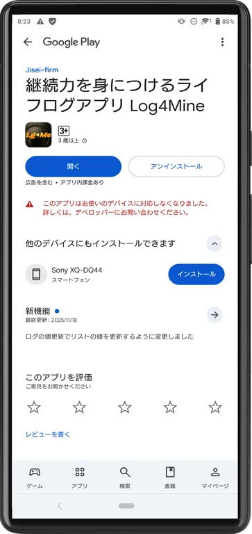 アプリ側で対応のOSバージョンやハードウェア要件を変えてないのに、Google Playアプリが「このアプリはお使いのデバイスに対応しなくなりました」と判断しました。