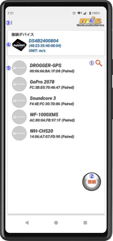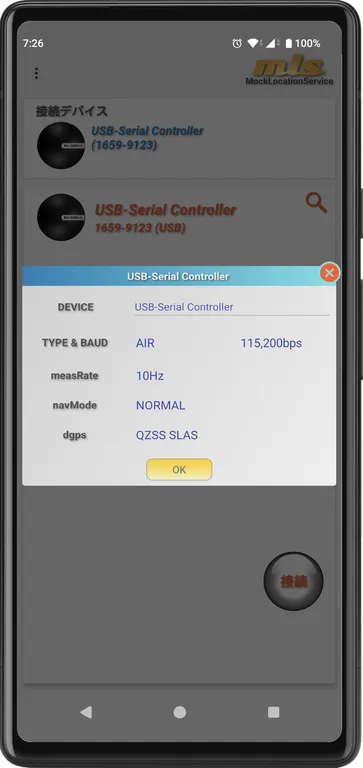 MLSは、Bluetooth(USB)で接続可能なGPSロガー(GPSレシーバ)を検索・接続します。